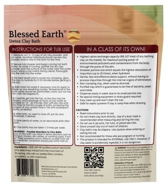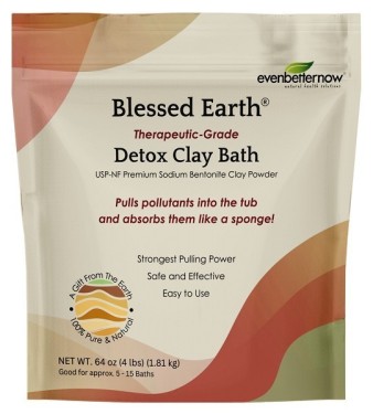 Blessed Earth® Detox Clay Bathby Evenbetternow, LLC, is 100% pure sodium bentonite clay which has the highest cation exchange capacity (CEC of 98-107 meq/100g) or "pulling power" for attracting toxins of any bathing clay that we tested on the market. This clay is a high purity air-classified sodium bentonite (sometimes referred to as sodium montmorillonite), selectively mined, consisting of micronized particles that exist as a free-flowing powder. Bathing in sodium bentonite clay helps to support the body's natural detoxification processes and pathways to eliminating harmful contaminants, pollutants and impurities from the body.