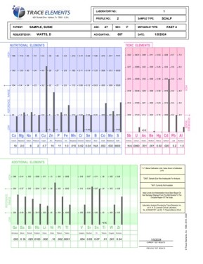 • Supplement recommendations provided by the lab are based upon age, sex, metabolic type, mineral patterns and specific needs as seen on the tissue mineral analysis and other accompanying clinical test data. Caution: Lab supplement recommendations do not take into account your unique health history or variables, which is why we recommend a personalized consultation.
